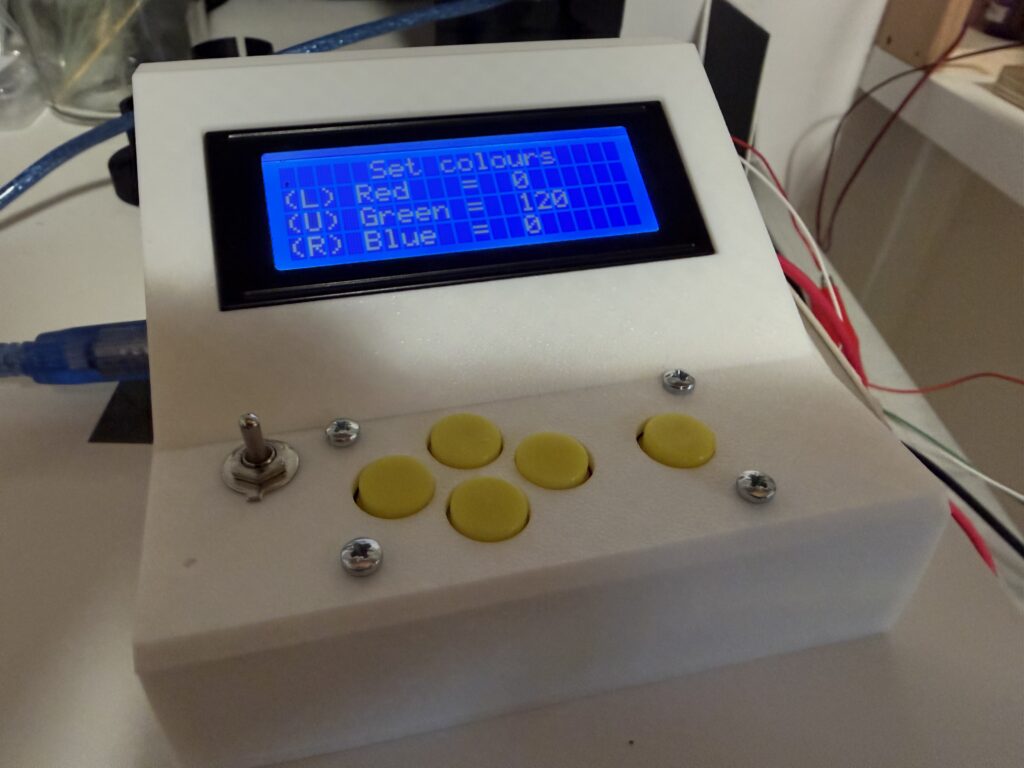 The control box for the LEDs consists of the Uno, a 5 button keypad and a 4-line I2C LCD screen. The Arduino and the power for the LEDs are provided separately because the Arduino cannot supply sufficient current from its 5V pin. The 3d printed control box is shown below. The Arduino, button pad and LCD were chosen because I had them lying around – I plan to replace the button pad arrangement with something more sophisticated but the current set up works well enough.