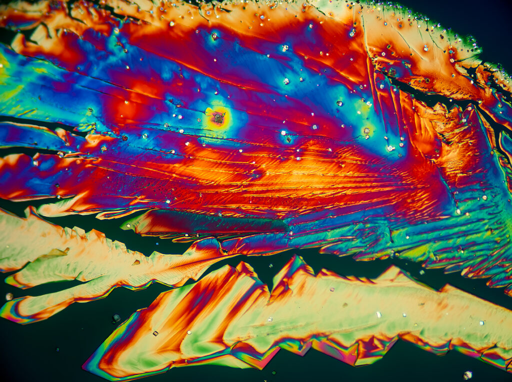 Tartaric acid crystals viewed using polarized light. An example of the invisible (birefringence) made visible – we are surrounded by such things but would never know.